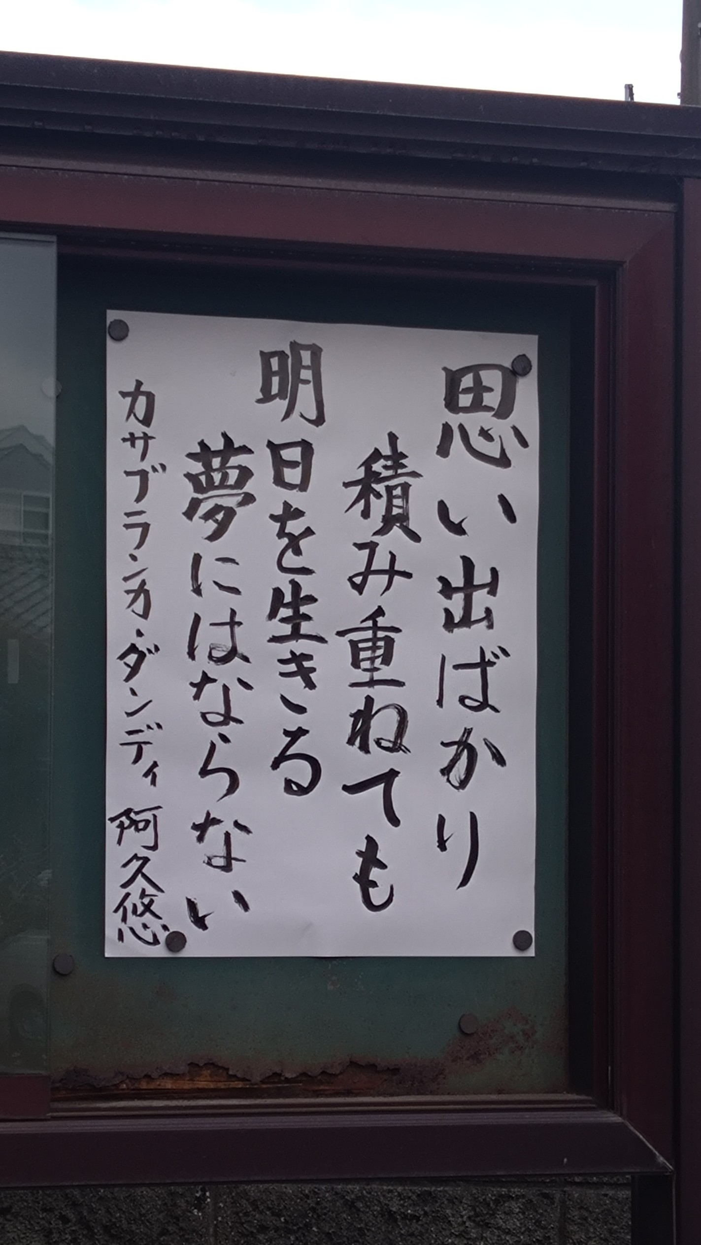 「思い出ばかり積み重ねても 明日を生きる夢にはならない」 カサブランカ・ダンディ 阿久悠 1979(昭和54)年2月(今から47年前!)に、沢田研二(ジュリー)さんが歌いヒットした曲「カサブランカ・ダンディ」(詞:阿久悠)からです。 イントロで手に持ったウイスキー瓶の中身を口に入れブワッと吹き出すシーンはかっこよく、当時小学生だった私もよくまねをしていました。 歌の内容自体は、気持ちが冷めてしまった女性と別れることのできない気障でカッコ悪い男の歌のようですが、紹介した部分が仏教っぽいなと感じ今月の言葉としました。 昔の楽しかった思い出は、時々思い出せばその時の活力になるものと思いますが、「あの時はよかった」「あの時に戻りたい」などといっていつまでもしがみつくのは、苦しみとなります。過去の武勇伝を若い人たちに語ったところで煙たがられるだけです。 「あの時はよかった」「あの時に戻りたい」という執着を手放してこそ、未来への夢につながるのだと思います。 過去にとらわれず、その時その場でするべきことをしっかりおこなうことが大切だと思います。 |