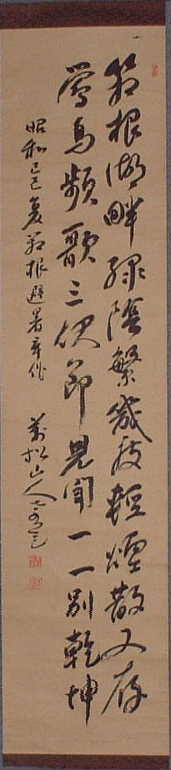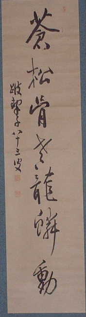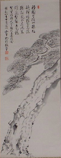 | 禅園曽植一株松 銕幹蟠根翠蓋濃 捲起風雲東海岸 雄姿髣髴上天龍 賀賢明禅人○版於高岳精舎 昭和八年十月念日 西堂修禅球学 |