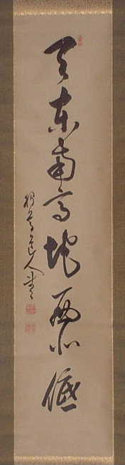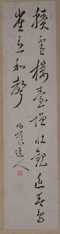 | 松風巌下夢猶穏 | (諸嶽)栴崖奕堂(1805(文化2)~1879(明治12)) 尾張の人。俗姓は平野氏、のち諸嶽氏に改める。 別号を無似子、三界無頼という。 14才、尾張聖応寺雪堂暁林に就いて出家。 のち出遊して、越後黄竜寺道契、美濃全昌寺洞門、浪花鳥鵲楼風外に歴参したが、のち暁林のもとに帰り、その法を嗣いだ。 弘化2年(1845)上野竜海院に住し、加賀天得院を経て、能登總持寺(独住第1世)に晋住した。 明治12年(1879)、巡錫中の羽前善宝寺に示寂。世寿75才。 著書に「懶眠余稿」がある |