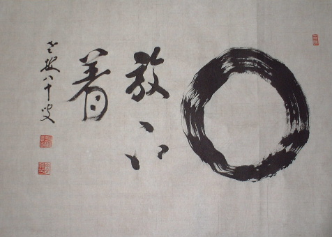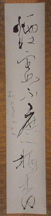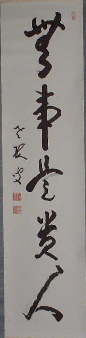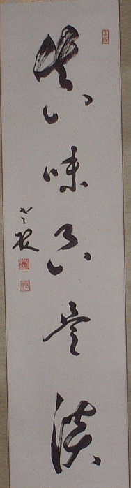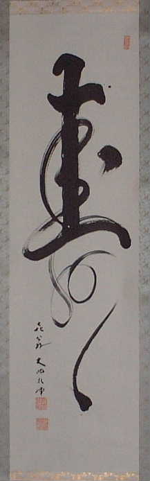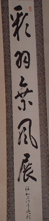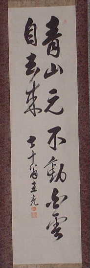 | 行亦禅 坐亦禅 | 「證道歌」に、 行亦禪坐亦禪、 ぎょうもまたぜん、ざもまたぜん 語默動靜體安然。ごもくどうじょう たいあんねん 縱遇鋒刀常坦坦、たとひほうとうにあふとも つねにたんたん 假饒毒藥也間間 たとひ どくやくもまたかんかん とある。 歩くことも禅であり、坐することも禅である。語るときも黙するときも動いているときも静かにしているときもその姿は安らかだ。たとえ刀の切っ先を突きつけられても平気である。またたとえ毒薬を盛られても気にしない。 箱裏に「記念 贈 人権擁護推進員 平尾賢明師 平成二年十二月吉日 曹洞宗第一宗務所 所長 大島賢龍 箱書」 とある。 昭和62年~平成2年、鳳林寺第六世賢明和尚が、静岡県第一宗務所人権擁護推進員の役職をさせていただいていた。平成2年12月、当時の宗務所長大島賢龍老師から記念にいただいたもの。 |
