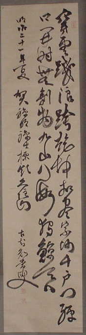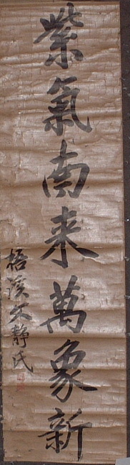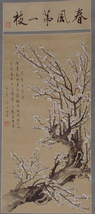 清代の画家、李方膺(りほうよう)の詩に、 「揮毫落紙墨痕新 幾點梅花最可人 願借天風吹得遠 家家門巷盡成春」とある。 「甲子年三月」とある。昭和63年に檀家、滝田五郎氏から中国土産で頂いたので、昭和59年(1984 甲子)の作か。 |