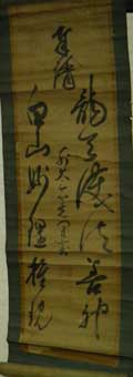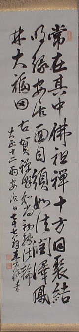 昭和八年(1933)10月、6世賢明和尚が、大井川・高岳寺において首座をつとめた時に、当時の修禅寺住職・丘球学老師よりいただいたもの。 | 丘球学(1877~1953) 明治10年愛知県岡崎市出身。14歳で出家。 大正4年伊豆修禅寺38世住職になる。 (この頃、鳳林寺六世賢明和尚が修禅寺で修行をしていた) 昭和12年永平寺後堂に就任。 昭和22年、永平寺西堂に就任、 昭和27年、永平寺初代副貫首。 昭和28年、修禅寺にて遷化。世寿77歳 |