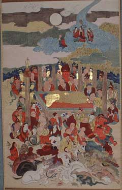 | (涅槃図) | 涅槃図とは、お釈迦さまが入滅(お亡くなりになる事)した時の様子を描いたものです。 お釈迦さまが入滅されたことを「涅槃に入る」ということから、この絵を涅槃図といいます。 曹洞宗の多くの寺院では、お釈迦さまが入滅したとされる2月15日に合わせて涅槃図を飾り、お釈迦さまを偲ぶ法要「涅槃会」を執り行います。 |