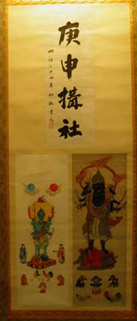 平成16(2004)年、中之郷の庚申講閉講に伴い、鳳林寺に納められたもの。2講あり、ひとつは、「庚申搆社」 もうひとつは青面金剛童子が描かれたものであった。未表具の青面金剛童子とともに合わせてひとつの掛軸に表具した。 詳しくは、庚申信仰 のページにて。 |