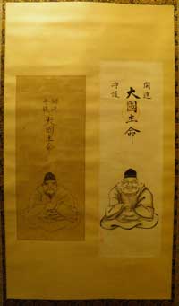 ![]() | 大国主命 | 平成16(2004)年、中之郷の庚申講閉講に伴い、鳳林寺に納められたもの。2講あり、別々であったが、ひとつの掛軸に表具した。 詳しくは、庚申信仰 のページにて。 |