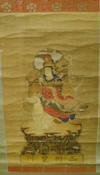 龍天護法善神の名を記した掛け軸のことで、修行に赴く際に、修行者自身の安全や、道念増長などを祈って携帯する。一般的には「白山妙理大権現・龍天護法大善神」と二神を並列に書く。 |