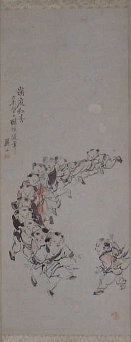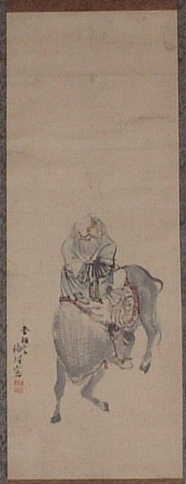 (賛) 平沢 常富(ひらさわ つねとみ、享保20年~文化10年)- 出羽国久保田藩の定府藩士で、江戸留守居。 朋誠堂喜三二(ほうせいどう きさんじ)の筆名で知られる戯作者、手柄岡持(てがらのおかもち)の狂名で知られる狂歌師でもある。通称は平角( 平格とも)、字は知足、号は愛洲。 隠居号は平荷。なお、上記のほか、青本では亀山人、笑い話本では道陀楼麻阿(どうだろう まあ)、俳号は雨後庵月成、朝東亭など多くの筆名や号を使い分ける。 (画) 高田圓洲 か? 書画辞典に「名は郷教、圓乗の子。狩野榮川院の風を能くす。享保年間の人なり」とある。 調査協力:田久 明 氏 |