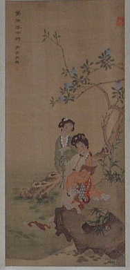 「香厳撃竹」(きょうげんげきちく)の話 (唐の香厳智閑が、道を掃除していたとき、突然飛んだ瓦礫(小石)が竹を撃った音を聞き、たちまち悟ったという故事)がモチーフか。 |