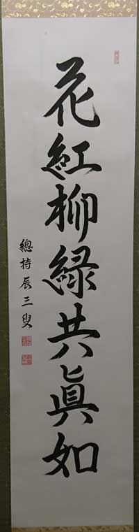 「花紅柳緑」とは、人が手を加えていない自然のままの美しさのこと。 紅い花と緑の柳ということから、春の美しい景色を言い表す言葉。 花は紅く、柳は緑という自然そのものの姿こそが悟りの境地である。 |