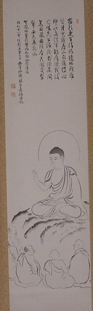 | (画)初転法輪 (賛) 宿願受生清海辺 幼齢薙髪月光嶺 廬山求道伝心印 比島従軍觸瘴煙 戦後尤嗟先公徳 機前深慮潤荒田 鳳林陞座花開處 髣髴西天鹿苑仙 |