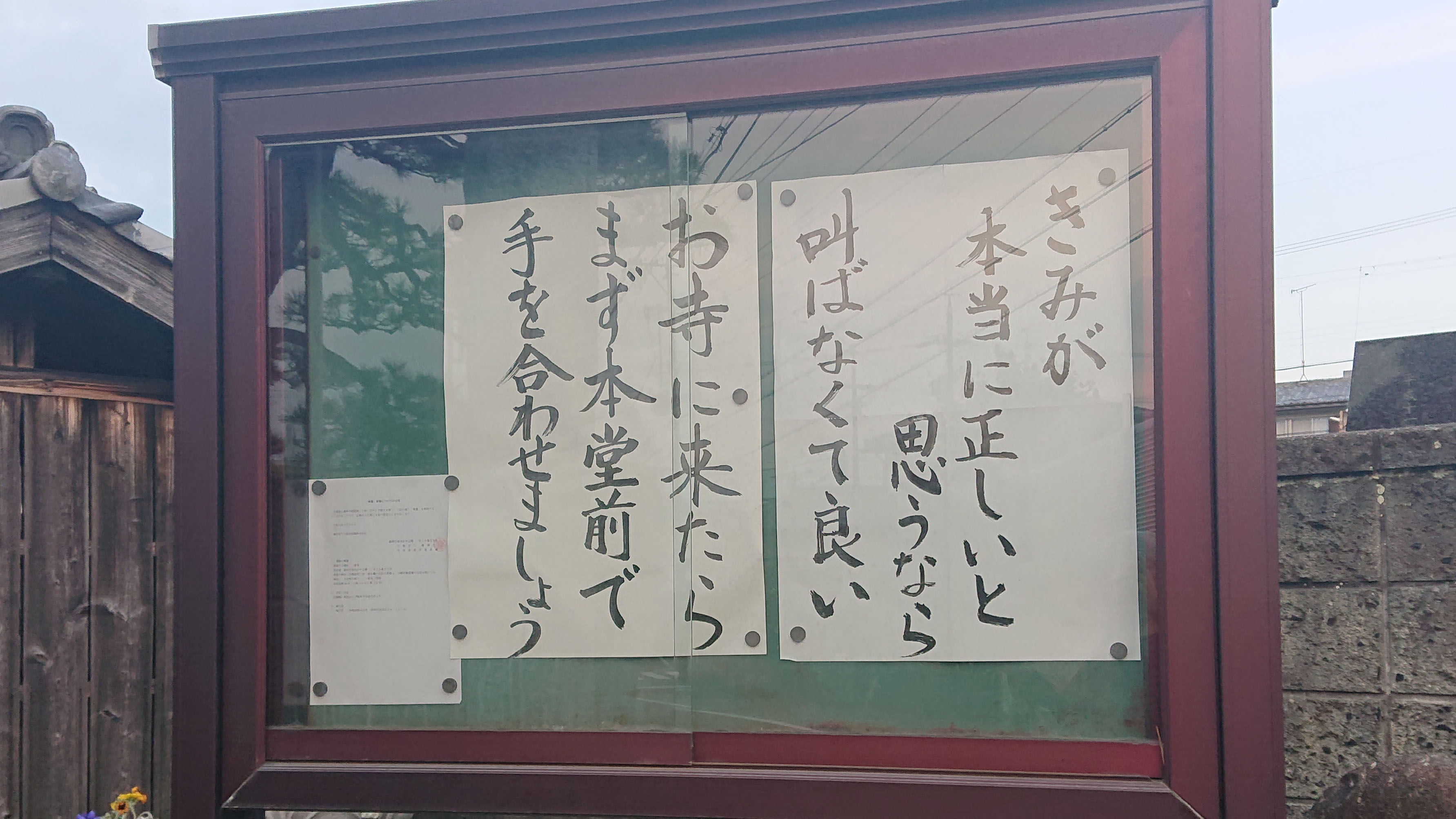 「きみが本当に正しいと思うなら、叫ばなくていい」 令和元年9月15日朝日新聞の「天声人語」からです。 「きみが本当に正しいと思うなら、叫ばなくて良い。なるべく小さな声で話しなさい」 正しいことでも大きな声で言えば反感を買い、そのうちだれからも聞いてもらえなくなるものです。 逆に、正しくない事を主張し、それを通そうとするから声が大きくなってしまうともいえます。大きい声で叫んでいる人はだいたい正しいことを言っていません。「庶民の小さな声を集めた」と言って、大きな声で叫ぶ人がいますが、それは小さな声を自分の良いように解釈し利用し、主張している場合が多いので注意が必要です。 正しいことを、小さな声で丁寧に伝えることこそが、多くの人から共感を得ることができる方法だと思います。 (令和元年12月、この言葉で 「輝け!お寺の掲示板大賞2019」にて、「笑い飯哲夫賞」をいただきました。 ) http://www.bdk.or.jp/kagayake2019/publication.html DIAMOND online で解説をいただきました。 https://diamond.jp/articles/-/219647 |