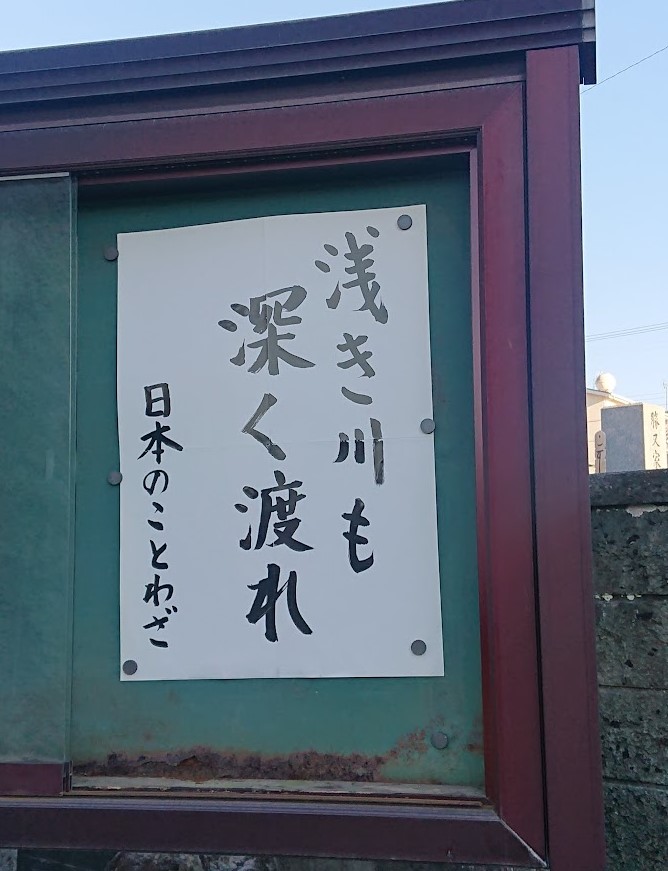 「浅き川も 深く渡れ」 日本のことわざです。たとえ浅い川を渡るときであっても足下を注意して渡りなさいということです。 浅い川であっても、注意して渡らなければ事故になる事もあります。よくよく注意して渡らなくてはなりません。 私たちは、何かをするときに、「簡単な事」「大変な事」などと分けて考え、簡単な事だと思うと手を抜き、大変な事だけ慎重に行いがちですが、どのような事であっても慎重に行いたいものです。 実は「簡単な事」「大変な事」など分け目はなく、どのような事であっても「大切に慎重に丁寧に行うべき事」なのだと思います。 禅語に「脚下照顧」という言葉があります。お寺の出入口などに掲示され「はきものをそろえよ」という意味に使われているようですが、本来は自分の足下(日常生活)を見て反省しなさいという意味です。常に自分の行動を反省し、わずかなこと、小さいことにも注意をはらい生活したいものです。 |