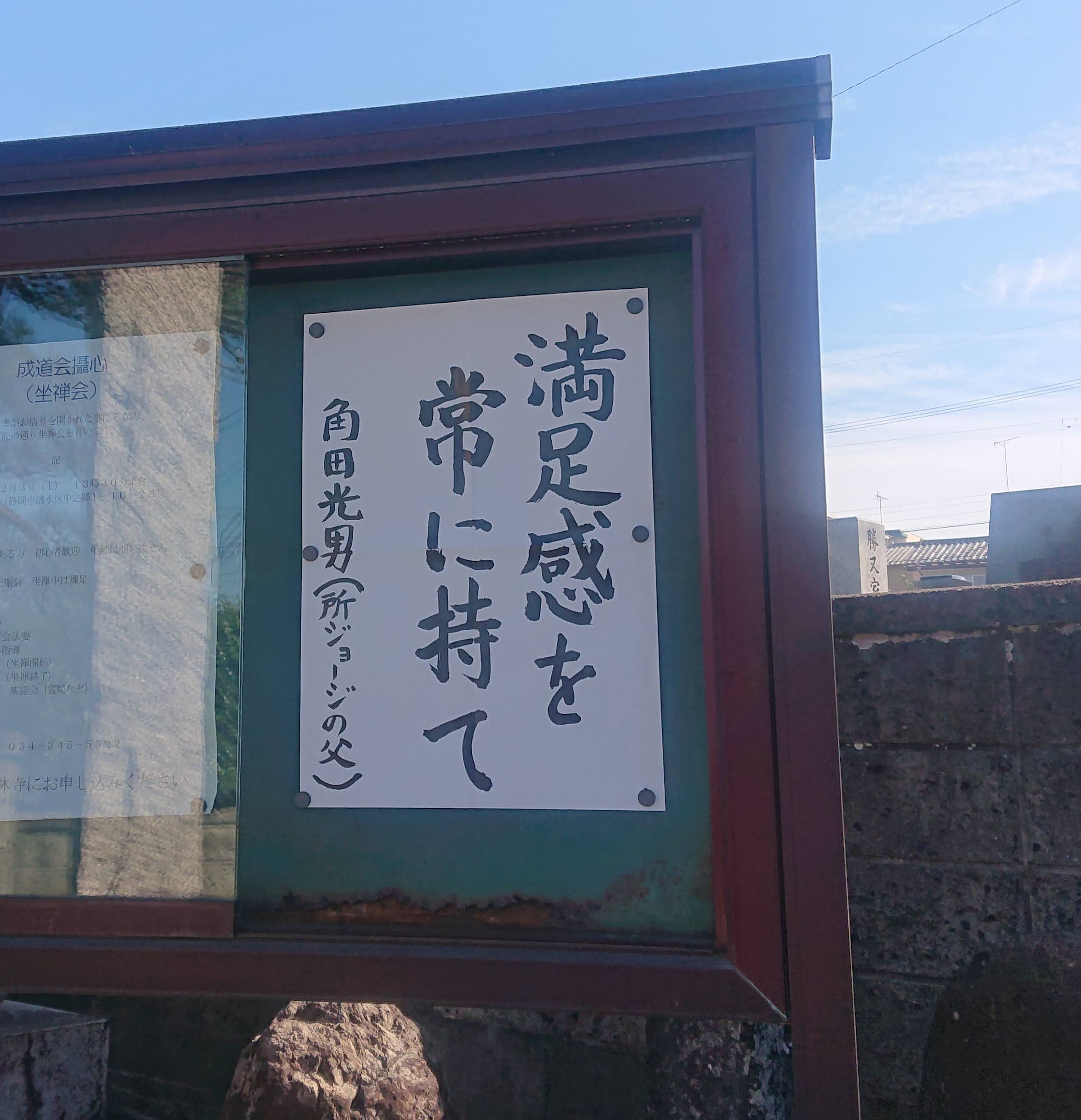 「満足感を常に持て」 角田光男(所ジョージの父) NHKの「ファミリーヒストリー」という番組があります。出演者のご先祖さまについて、家族の歴史について調べ紹介する番組です。 この番組に先日、タレントの所ジョージさんが出演されました。 その中で、所ジョージさんのお父様が、自宅の台所に「満足感を常に持て」と筆書きで書いて貼った、というエピソードが紹介されました。 所さんは、いつも気楽で力が抜けている感じで、そこが大変魅力的なタレントさんだと私は思いますが、所さんは、この「満足感を常に持つ」という言葉の通り、欲しい欲しいとガツガツせず、あればあるなりに、なければないなりに楽しく過ごして生きてきたのではないか、と思いました。それが所さんの魅力につながっているのかなぁと想像します。 仏教には「少欲知足」という言葉があります。欲を少なくして、常に足りている事に気づきましょうという教えです。私たちも、満足感を常に持ち、所ジョージさんのような楽しそうな人生を送ってみたいものです。 |